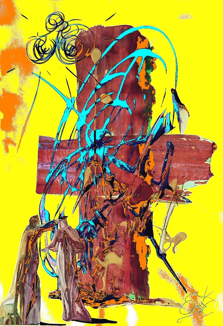 Helmut Gerigk sitzt an einem großen Holztisch in dem überfüllten Atelier von Salvador Dalí in Figueres, umgeben von eigenen und den Meisterwerken des berühmten Malers. Das Licht fiel sanft durch das große Fenster und beleuchtete die skurrilen Formen und lebhaften Farben, die den Raum prägten. Dalí, mit seinem unverwechselbaren Schnurrbart und dem typisch exzentrischen Auftreten, bewegte sich mit einer Mischung aus Leidenschaft und Gelassenheit durch den Raum, als er über die Gestaltung eines neuen Bilderzyklus zur 'Divina Commedia' spicht.