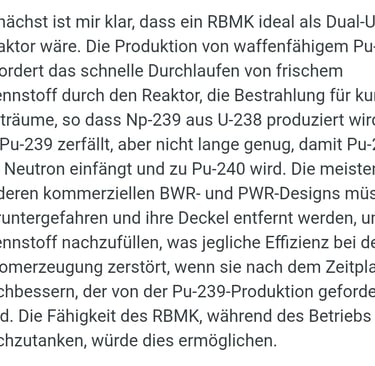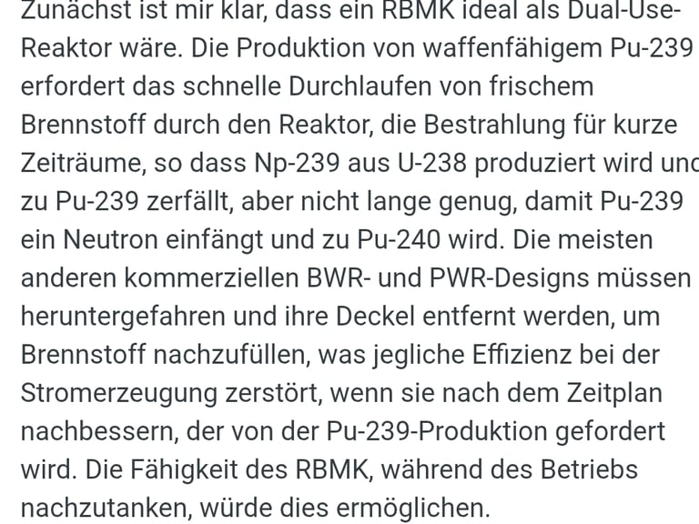 Natururan enthält nur 0,7% waffenfähiges U235. Über eine Plutoniumwirtschaft könnten die 99% U238 für die Herstellung von Plutonium Pu 239 genutzt werden ! Reaktoren zur Herstellung von Pu 239 sind Graphit moderiert.